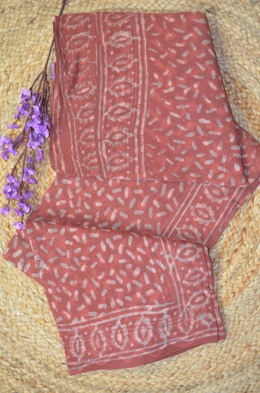 STEAL DEAL ACTIVATED!Rust Chiffon Bagru Print Vegan Silk Handloom Saree