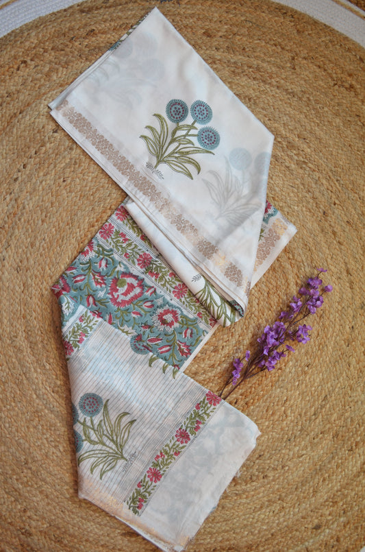 STEAL DEAL ACTIVATED!Beige Teal Block Print Pure Silk Handloom Saree