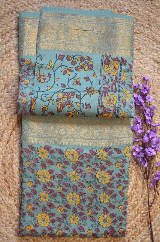 STEAL DEAL ACTIVATED!Grey Seafoam Kalamkari Vegan Silk Handloom Saree
