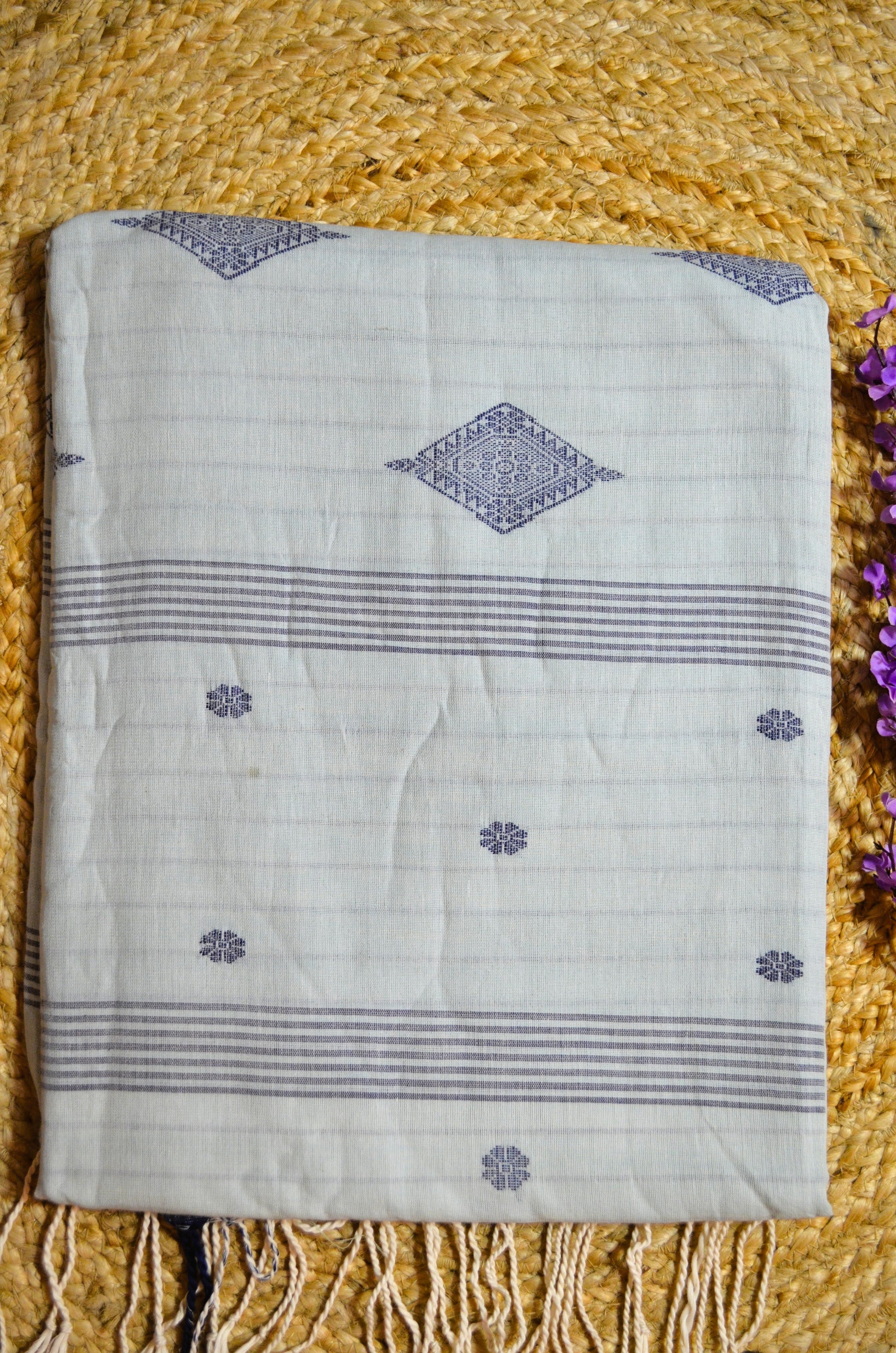 This Saree, crafted by a Master Weaver in Bengal using Butter Cotton, is a true work of art. Butter Cotton, a refined variant of mulmul cotton/mul cotton, is stronger and softer due to an extra twist in the yarn. These handwoven sarees feature intricate patterns, delicate motifs, and vibrant colors. Lightweight and breathable, they are perfect for both Casual and Festive occasions. Certified with the Handloom Mark, this saree exemplifies skilled craftsmanship.