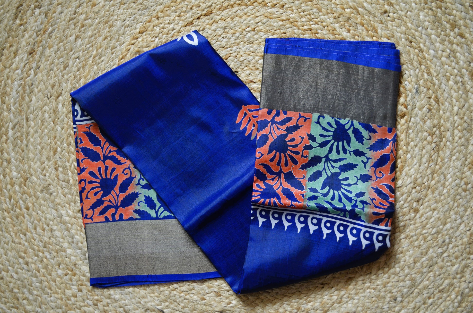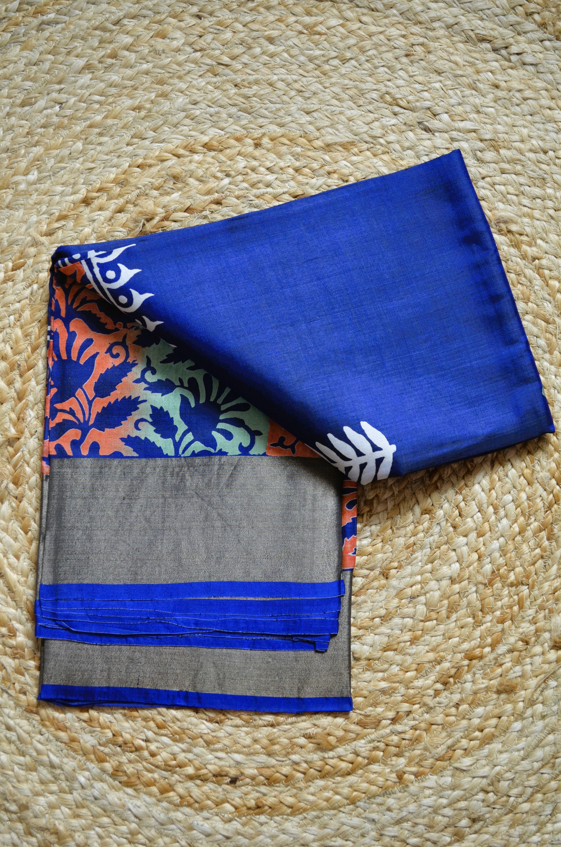 Navy Blue Katan Pure Silk Handloom Saree with Block Prints