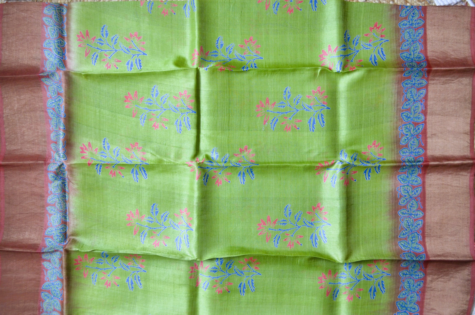 Olive Green Tussar Pure Silk Handloom Saree with Block Prints