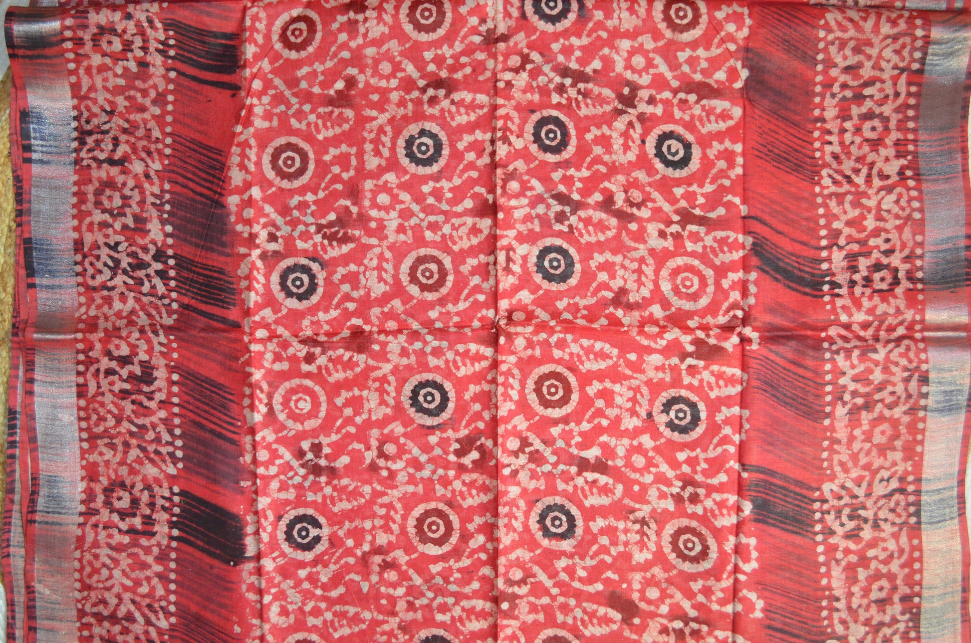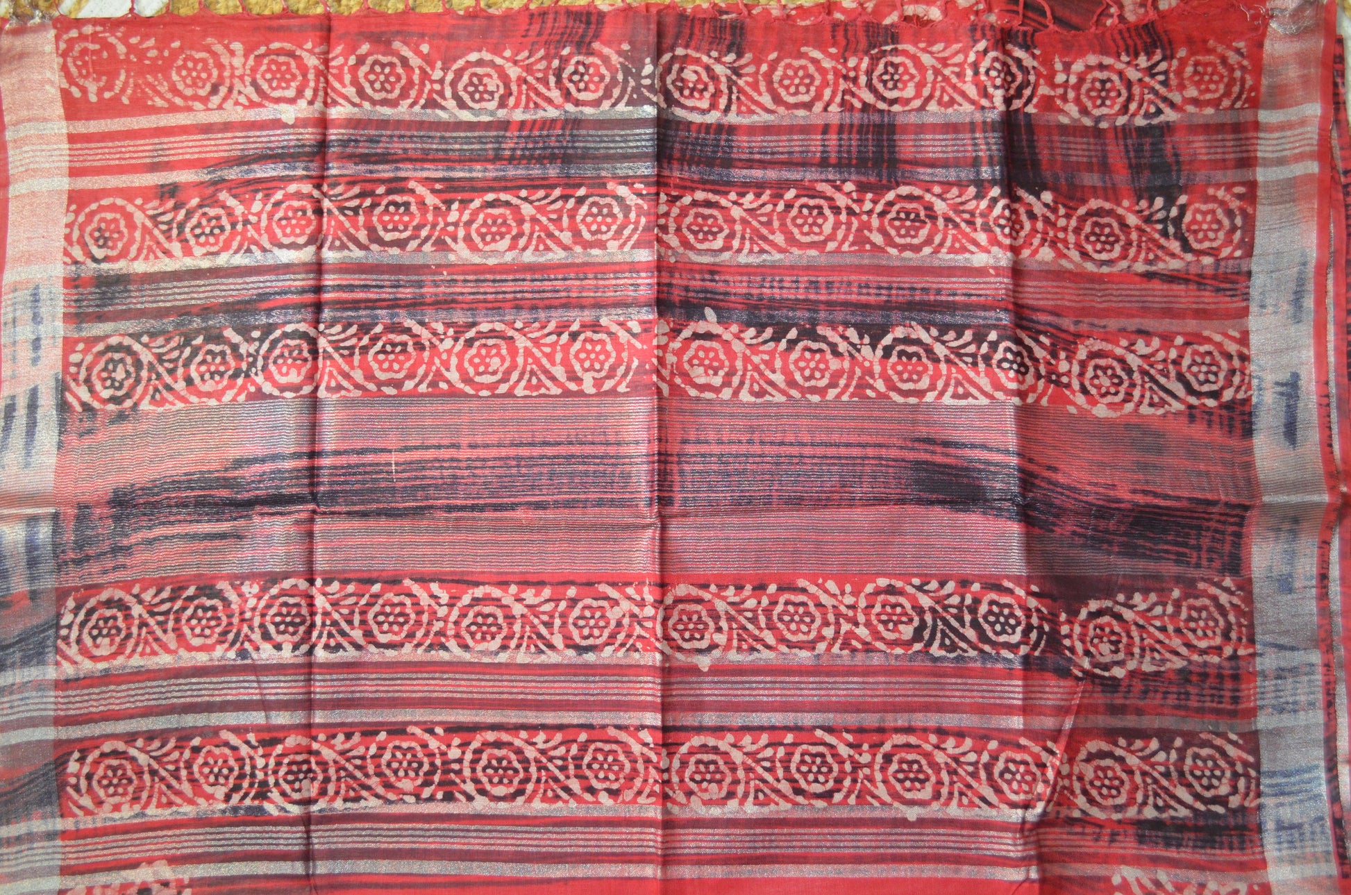 Red Block Print Linen Handloom Saree