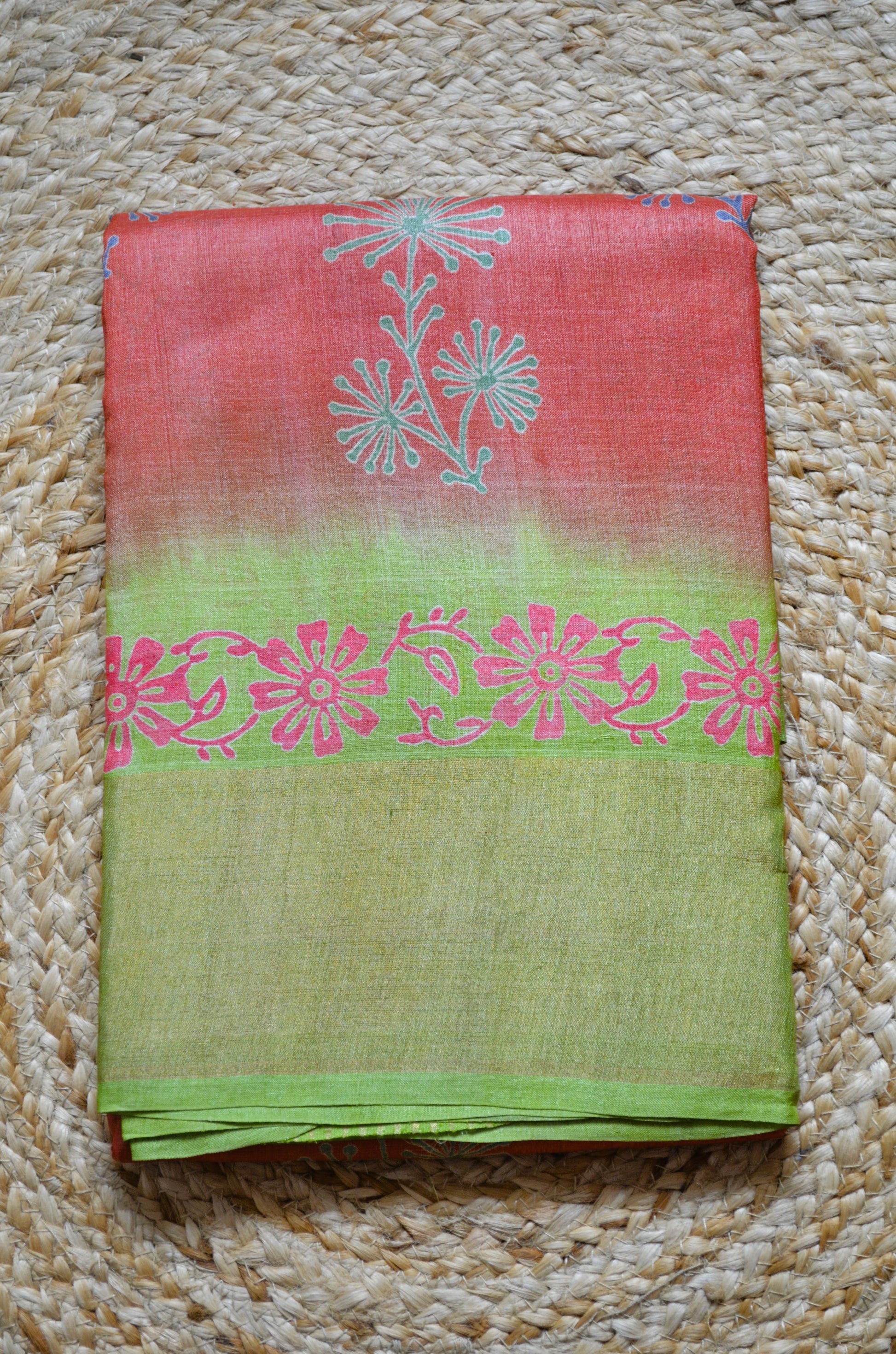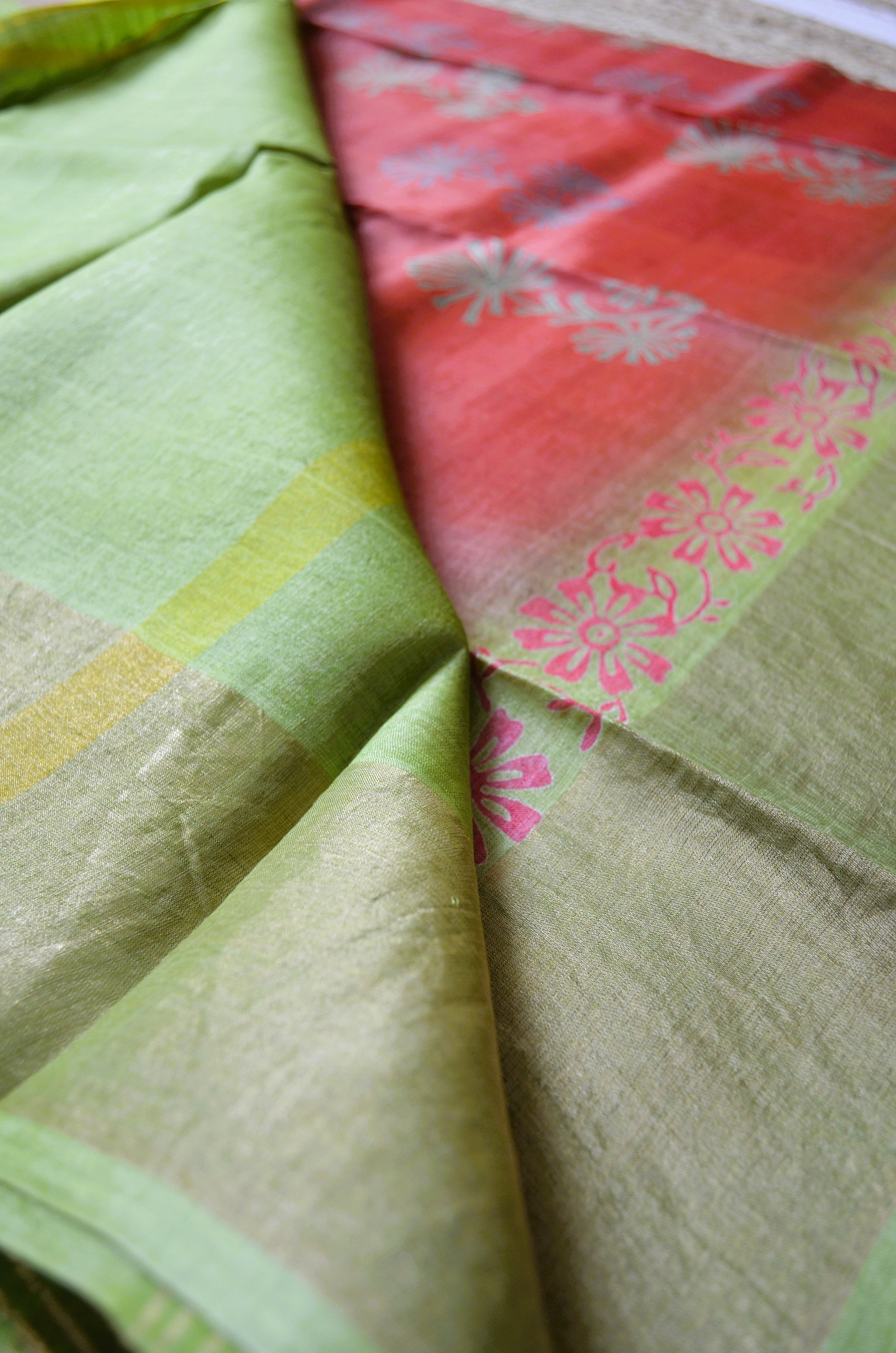 Rust Tussar Pure Silk Handloom Saree with Block Prints